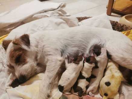 Der kleinen Familie geht es sehr gut .Winnie ist eine fürsorglich Mama und die Welpen sind schön propper ! Die Milch schmeckt und es ist reichlich vorhanden !